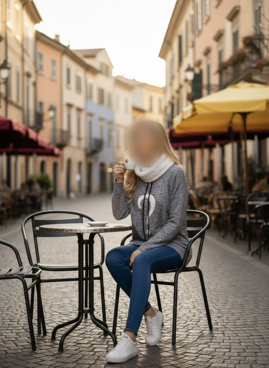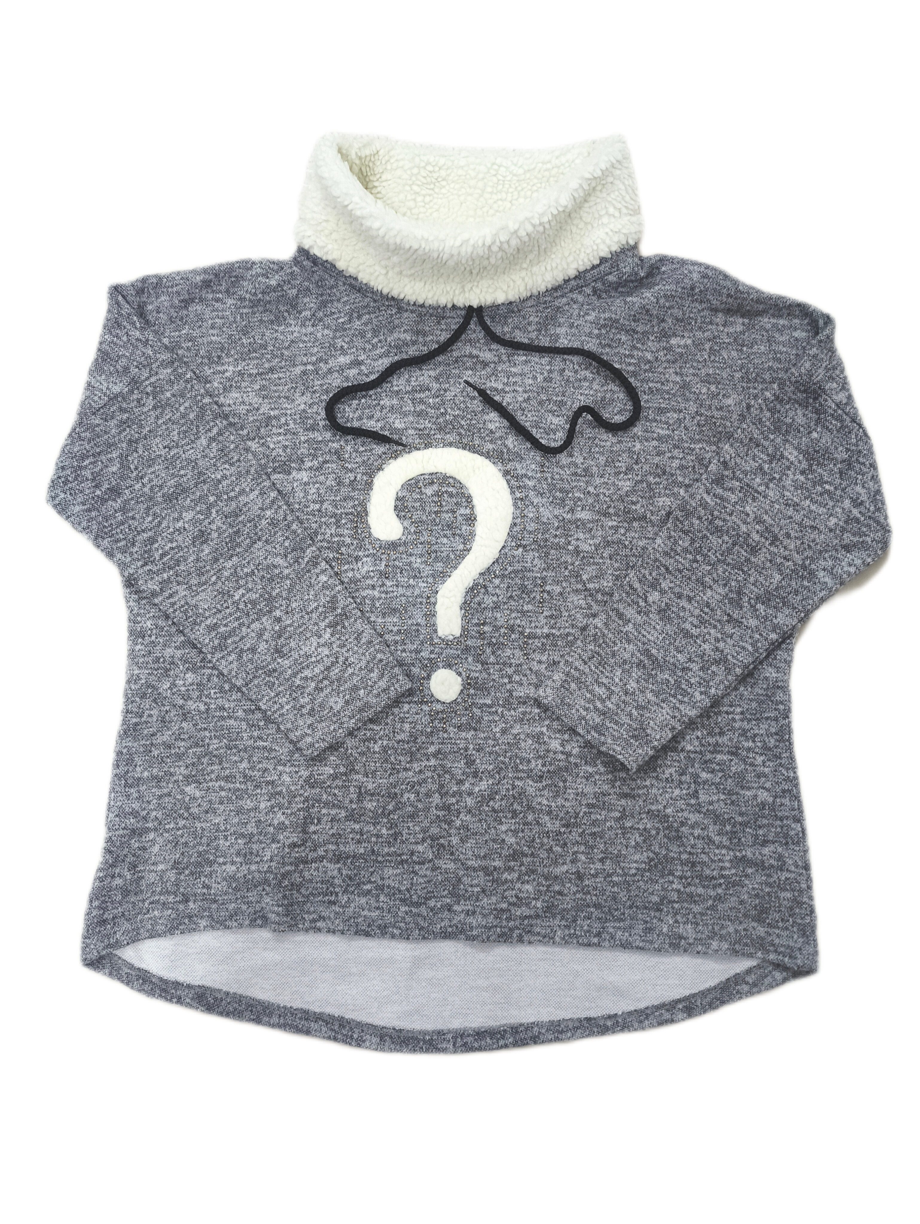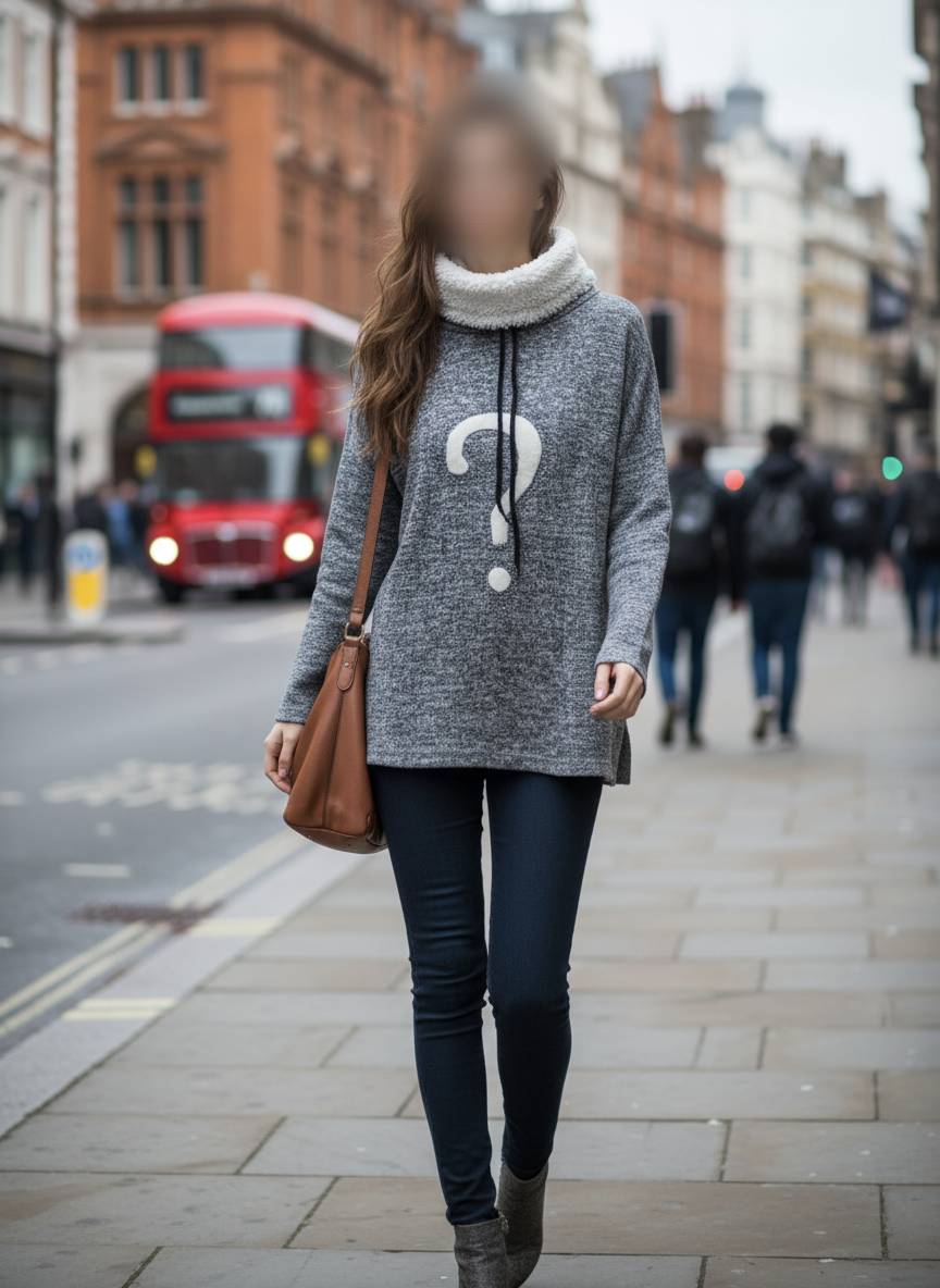 یقه حجیم خزدار، بندهای مشکی تضاددار و علامت سؤال پشمی روی سینه، همه با دوخت تمیز و ظرافت ایتالیایی ترکیب شدهاند تا یک سوشرت متفاوت خلق شود — لباسی که هم در کژوال شهری و هم در استایل نیمهفشن روزانه، کیفیت را فریاد میزند.