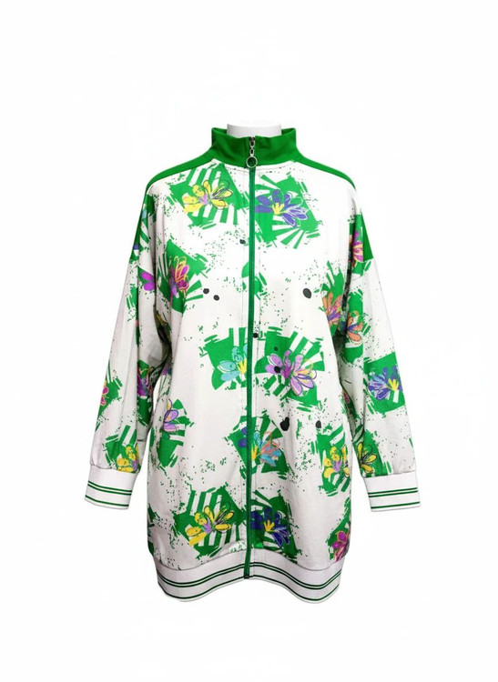 زمینه و طرح: زمینه سفید با طرح گلدار جذاب به رنگهای سبز و بنفش، که جلوهای شاداب و زنانه به سویشرت میبخشد.